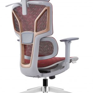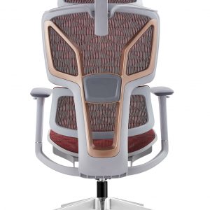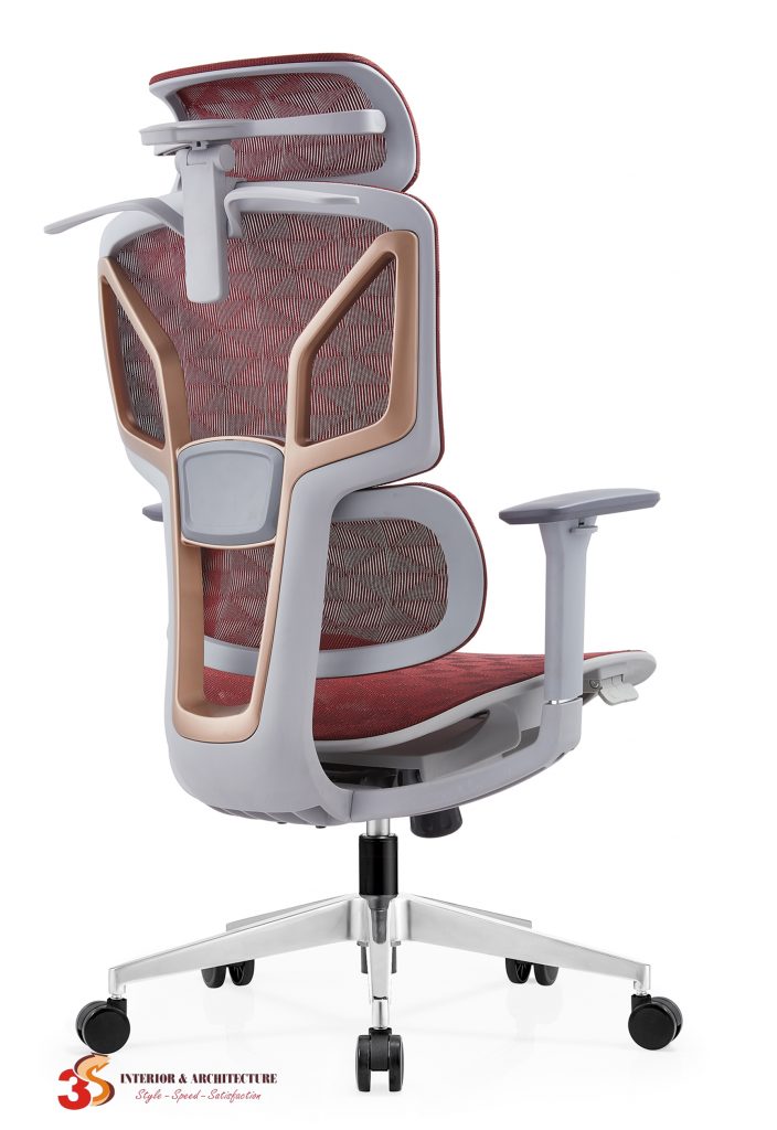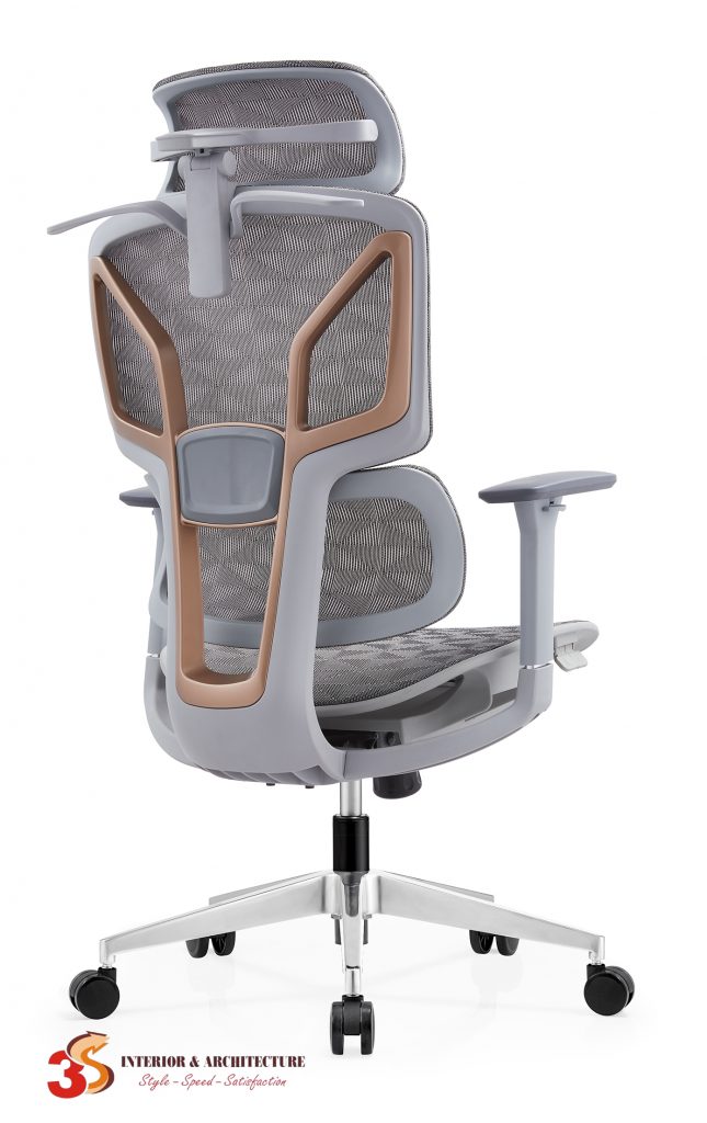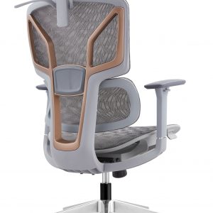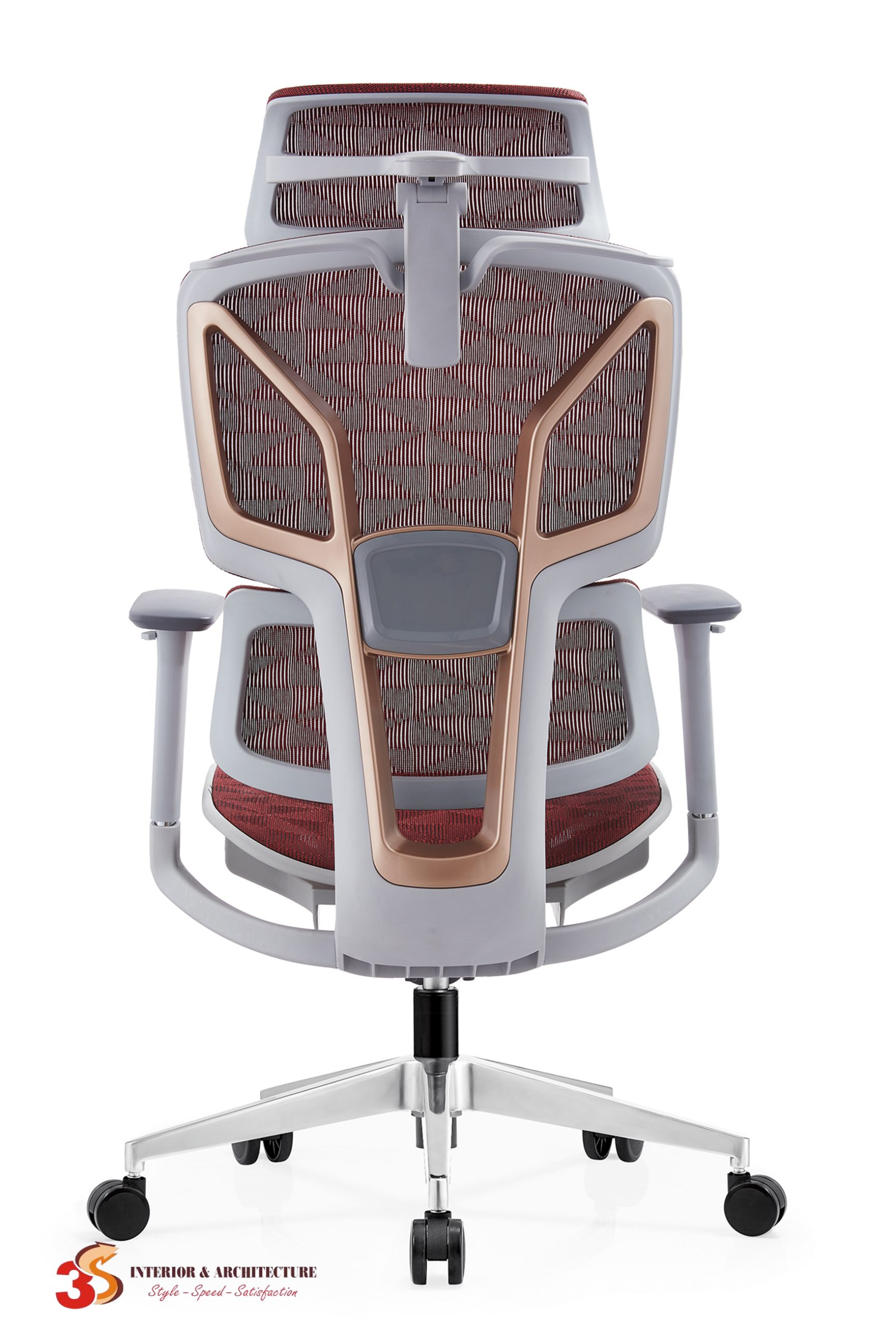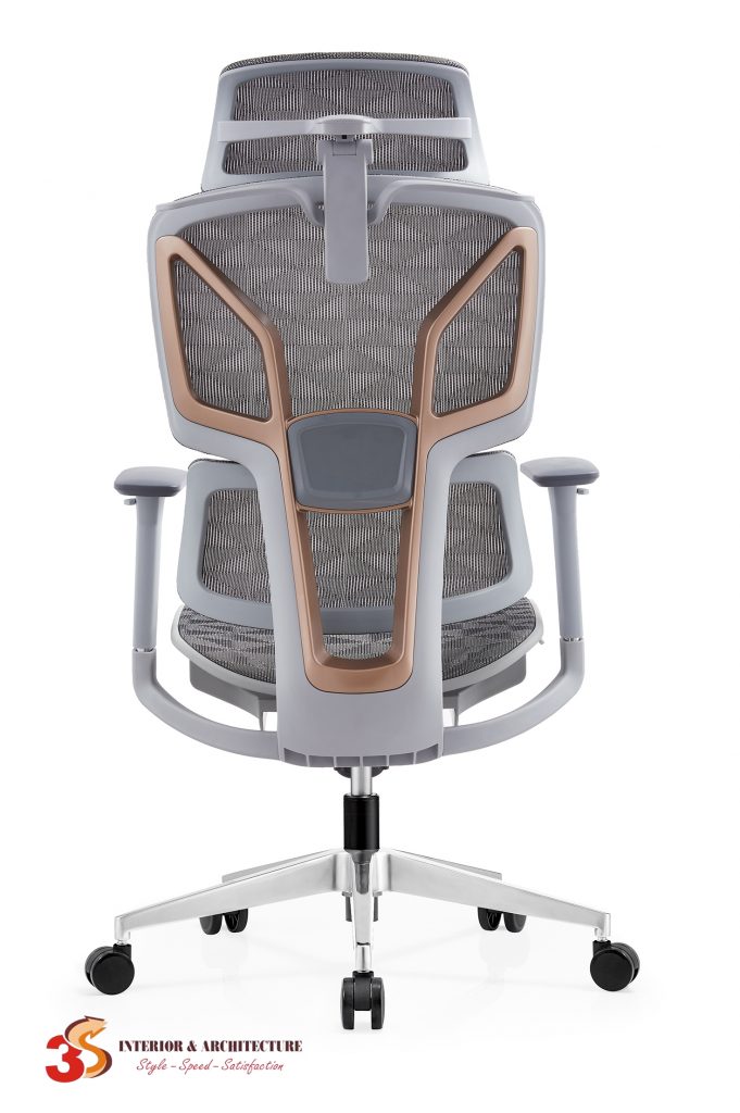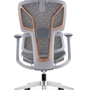 Lưng ghế: Khung lưng PA+30%GF màu xám, khung lưng kết nối bằng giá đỡ âm sơn tĩnh điện màu hồng vàng (rose gold), thiết kế tách rời lưng – thắt lưng, tựa thắt lưng ôm sát với đệm đôi lò xo, phù hợp nhiều chiều cao người dùng.